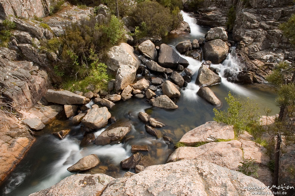 Gebirgsbach mit Wasserfällen und Felsen, Oso-Bach, Piscia di Gallo Korsika, Frankreich