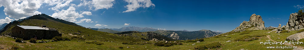 Gebirgspanorama, Plateau d'Alzo mit Bergerie de Cappelacio, Blick auf Paglia Orba und Massiv des Monte Cinto, Korsika, Frankreich