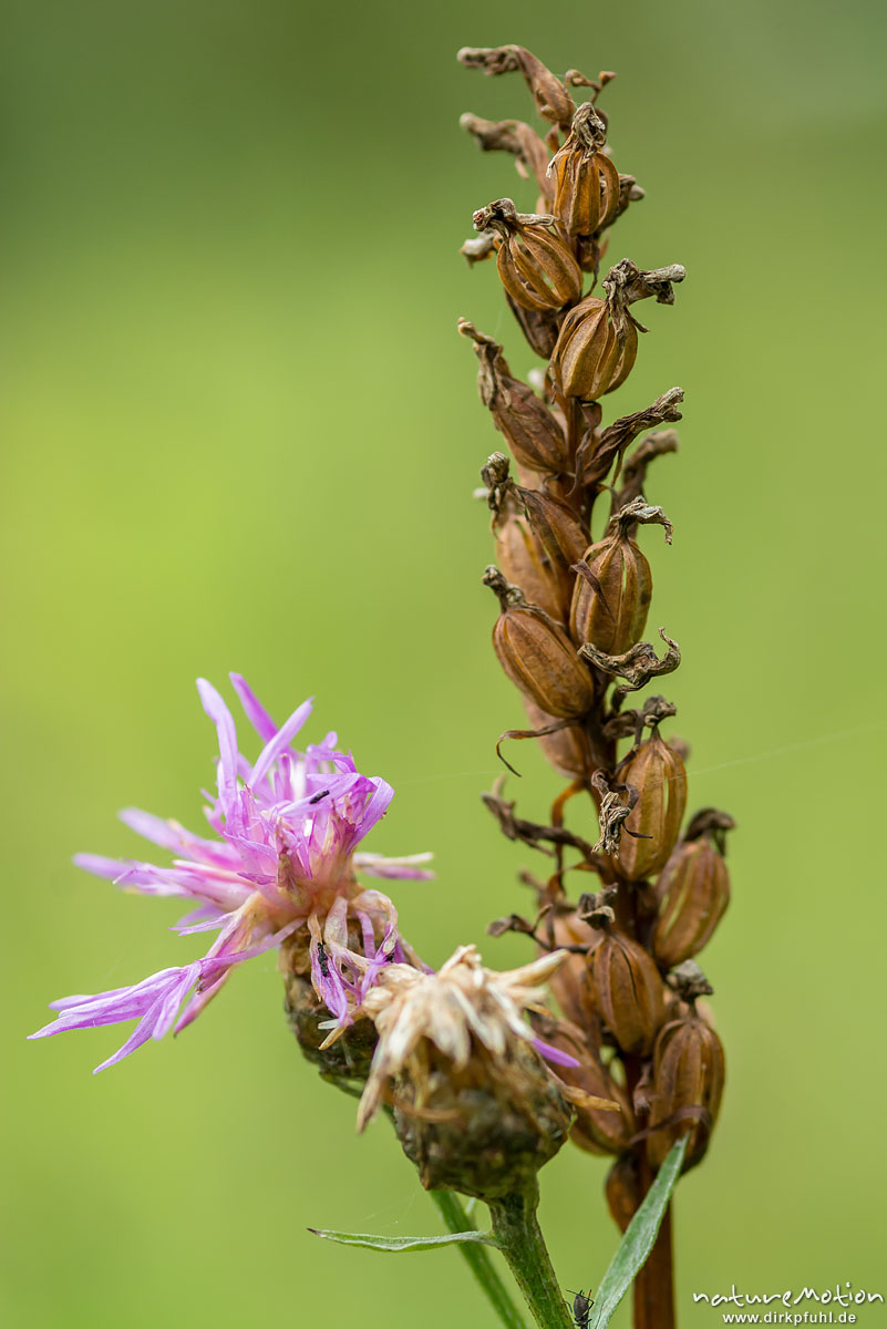 Geflecktes Knabenkraut, Dactylorhiza maculata, Orchideen (Orchidaceae) ,Fruchtstand, Samenkapseln leer, daneben Blüte einer Flockenblume, Kerstlingeröder Feld, Göttingen, Deutschland