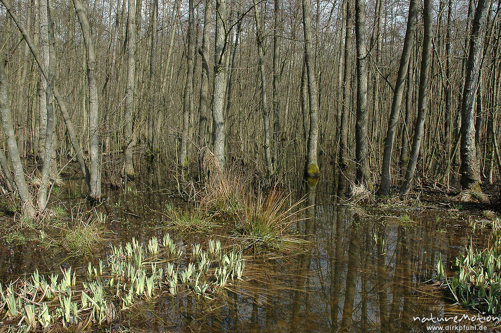 gefluteter Erlenbruch im Frühjahr, Wasserflächen und sprießendes Schilf, Tripkenpfuhl, Göttinger Wald, Göttingen, Deutschland