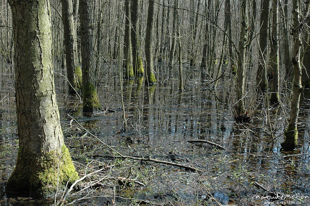 gefluteter Erlenbruch im Frühjahr, Wasserflächen und sprießendes Schilf, Tripkenpfuhl, Göttinger Wald, Göttingen, Deutschland