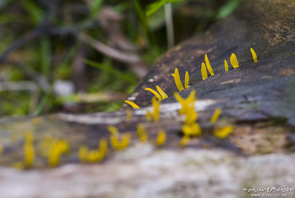 Gegabelter Nadelholz-Hörnling, Calocera furcata, Tränenpilzartige (Dacrymycetaceae), auf Kiefernstamm, Bohinjer See Wocheiner See, Slowenien