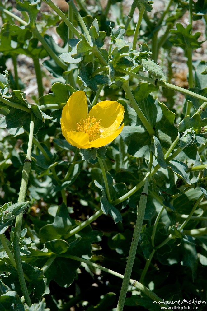 Gelber Hornmohn, Glaucium flavum, Papaveraceae, Strand von Rondinaria Korsika, Frankreich