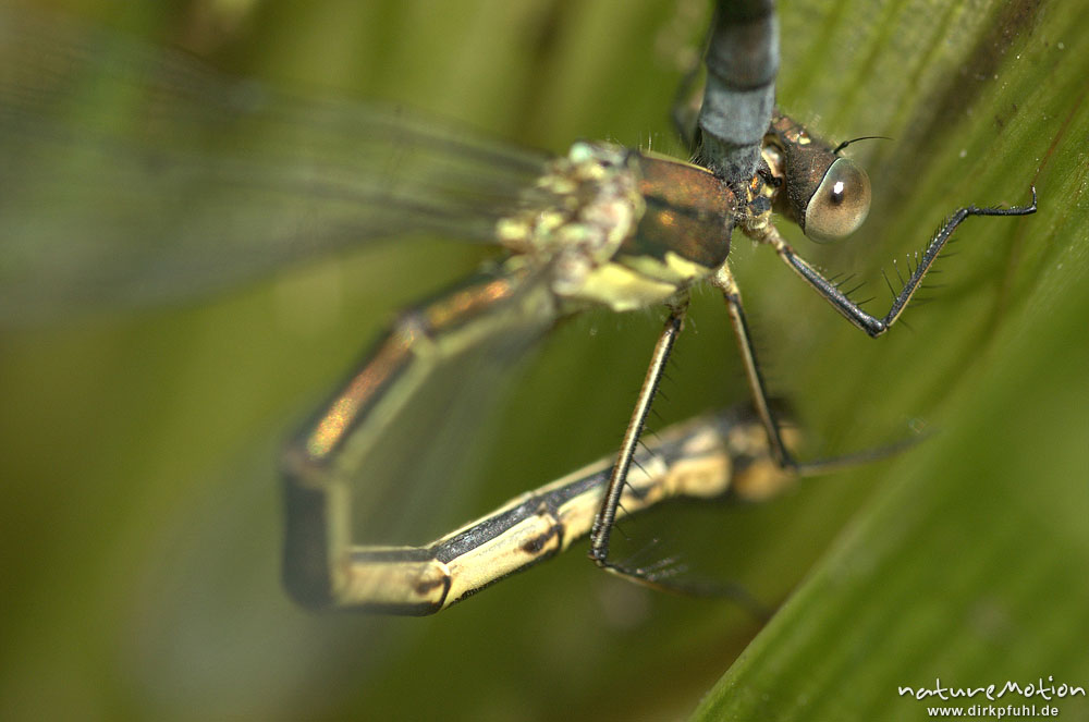 Gemeine Binsenjungfer, Lestes sponsa, Weibchen Männchen, Eiablage mit Detail Hinterleibsanhänge und Prothorax, Kerstlingeröder Feld, Göttingen, Deutschland