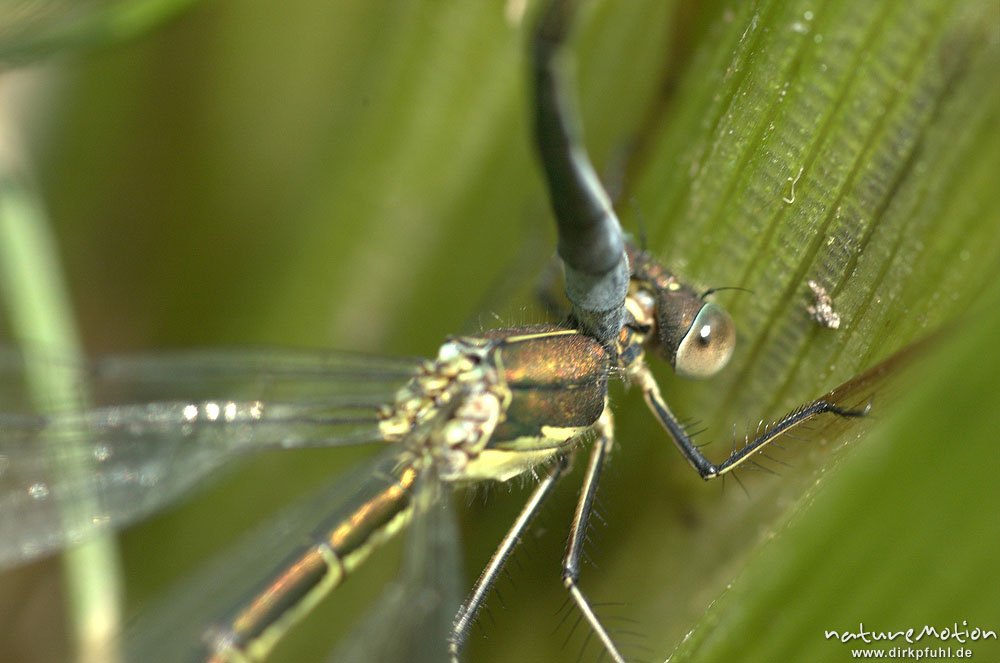 Gemeine Binsenjungfer, Lestes sponsa, Weibchen Männchen, Eiablage mit Detail Hinterleibsanhänge und Prothorax, Kerstlingeröder Feld, Göttingen, Deutschland