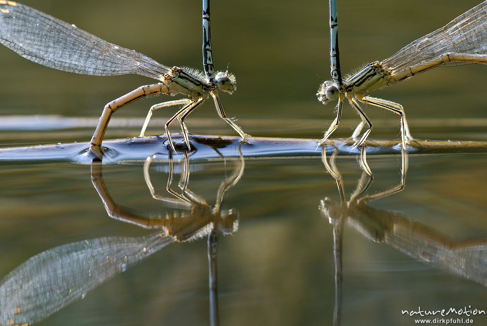 Gemeine Federlibelle, Blaue Federlibelle, Platycnemis pennipes, Platycnemidae, Paare bei der Eiablage in schwimmende Pflanzenteile, Spiegelung im Wasser, Pagelsee, A nature document - not arranged nor manipulated, Granzin, Deutschland