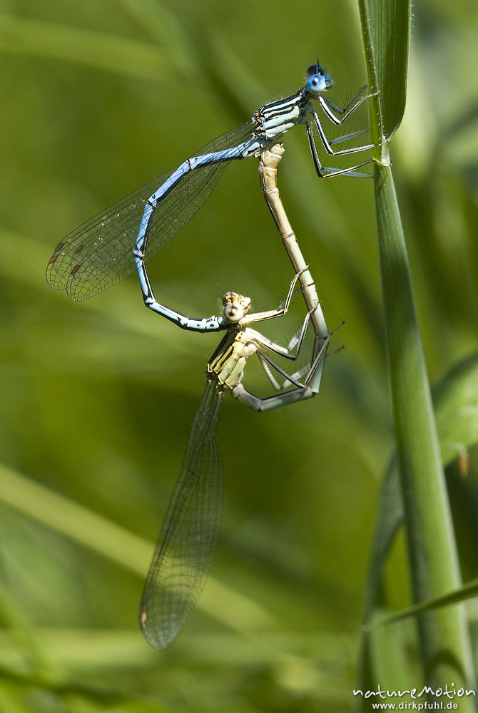 Gemeine Federlibelle, Blaue Federlibelle, Platycnemis pennipes, Platycnemidae, Paarungsrad an Grashalm, Babker Mühle, A nature document - not arranged nor manipulated, Babke, Deutschland