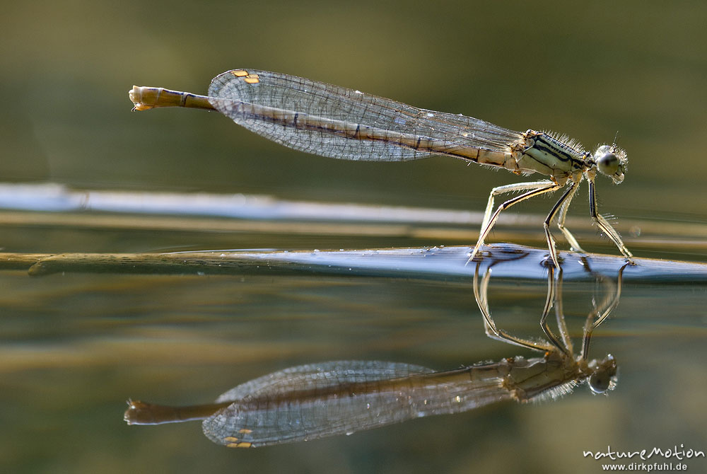 Gemeine Federlibelle, Blaue Federlibelle, Platycnemis pennipes, Platycnemidae, Weibchen nach Eiablage allein auf schwimmendem Pflanzenteil, Spiegelung im Wasser, Pagelsee, A nature document - not arranged nor manipulated, Granzin, Deutschland