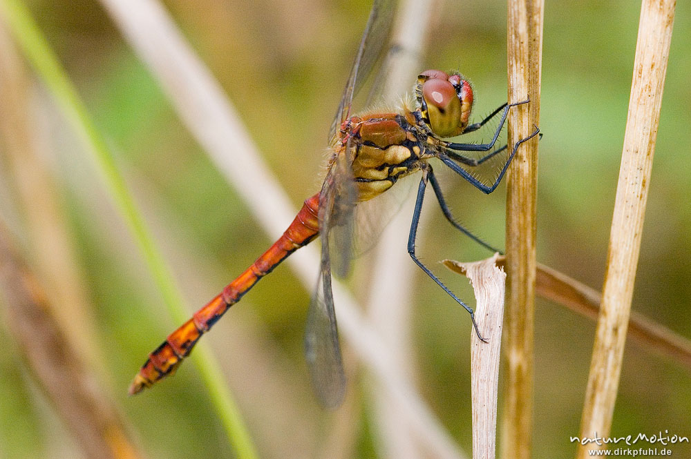 Gemeine Heidelibelle, Sympetrum vulgatum, Libellulidae, Männchen, im Gras, Tripkenkuhle Göttingen, Deutschland