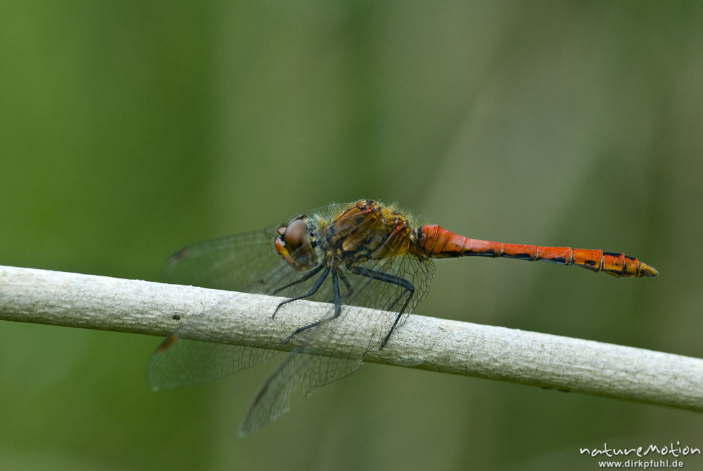 Gemeine Heidelibelle, Sympetrum vulgatum, Segellibellen (Libellulidae), Männchen auf Binsenhalm, Seitenansicht, Tripkenpfuhl, Göttingen, Deutschland