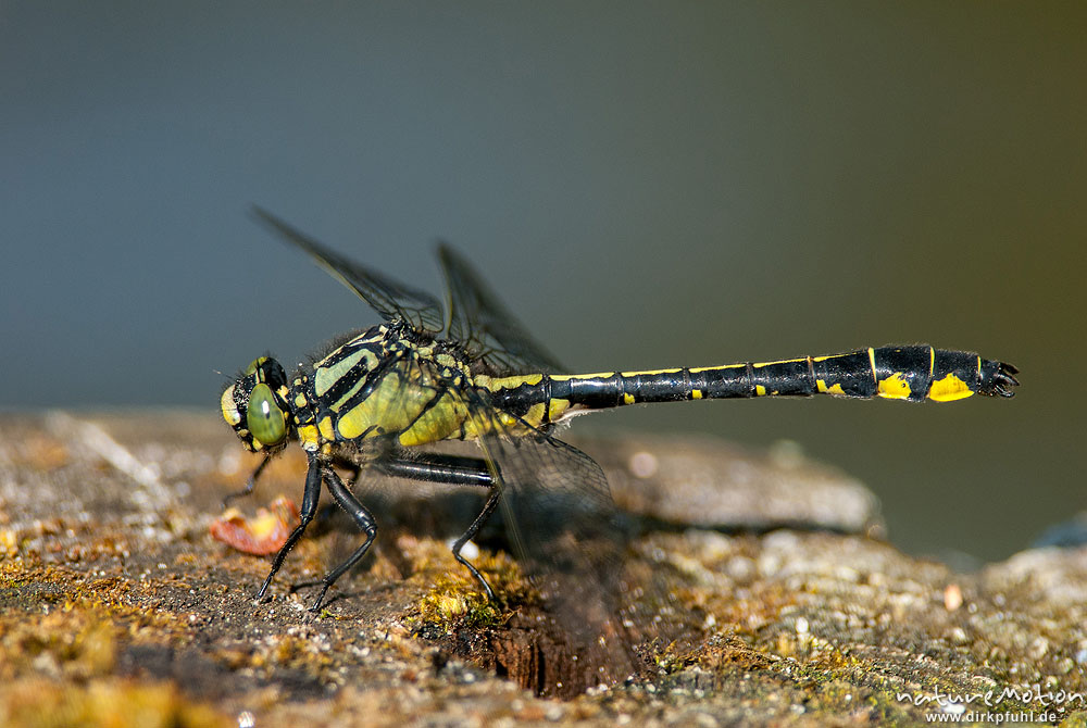 Gemeine Keiljungfer, Gomphus vulgatissimus, Flussjungfern (Gomphidae) Männchen auf Ansitz (moodbedeckter Holzpfahl im Wasser), Pagelsee, A nature document - not arranged nor manipulated, Kratzeburg, Deutschland