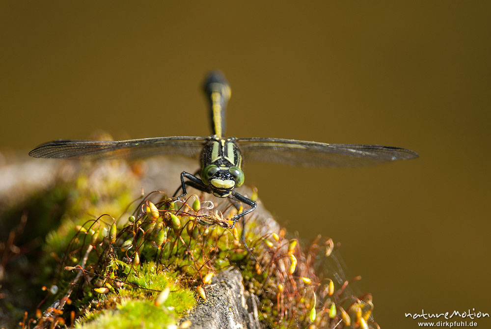 Gemeine Keiljungfer, Gomphus vulgatissimus, Flussjungfern (Gomphidae) Männchen auf Ansitz (moodbedeckter Holzpfahl im Wasser), Pagelsee, A nature document - not arranged nor manipulated, Kratzeburg, Deutschland