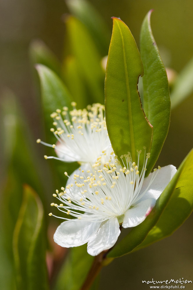 Gemeine Myrte, Myrtis communis, Blüten und Blätter, Macchia bei Porto Vecchio Korsika, Frankreich
