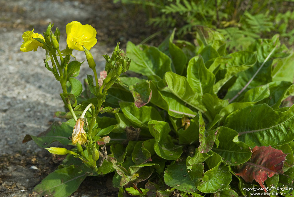 Gemeine Nachtkerze, Gewöhnliche Nachtkerze, Oenothera biennis, Nachtkerzengewächse (Onagraceae), Blüte und Laubblätter, Weg, Cheiner Torfmoor, Cheine/Salzwedel, Deutschland