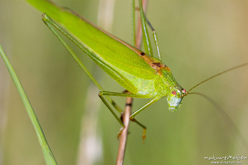 Gemeine Sichelschrecke, Phaneroptera falcata, Phaneropteridae, Männchen an Grashalm, Kerstlingeröder Feld, Göttingen, Deutschland