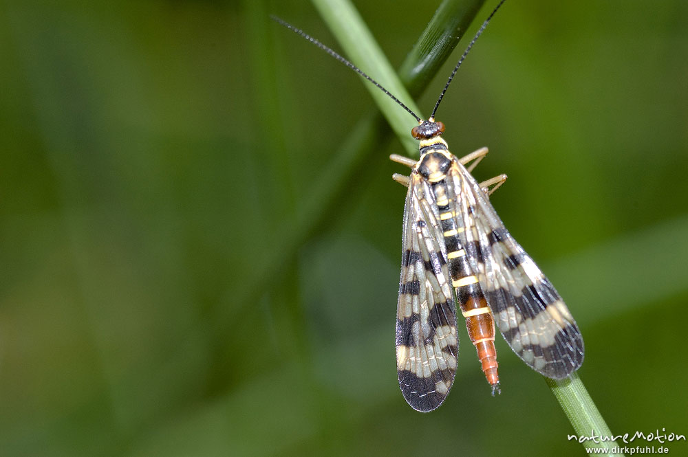 Gemeine Skorpionsfliege, Panorpa communis, Panorpidae, Weibchen, an Binsenstängel, Tripkenpfuhl, Herberhäuser Stieg, Göttingen, Deutschland