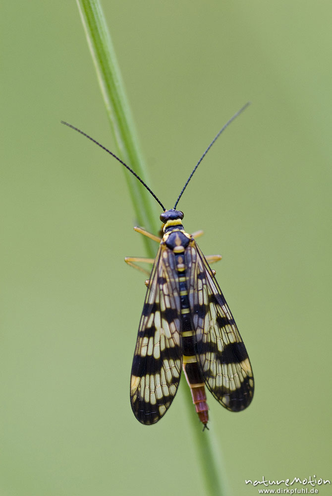 Gemeine Skorpionsfliege, Panorpa communis, Panorpidae, Weibchen auf Grashalm, Aufsicht, Streuobstwiese am Sengerfeld, Göttinger Wald, A nature document - not arranged nor manipulated, Göttingen, Deutschland