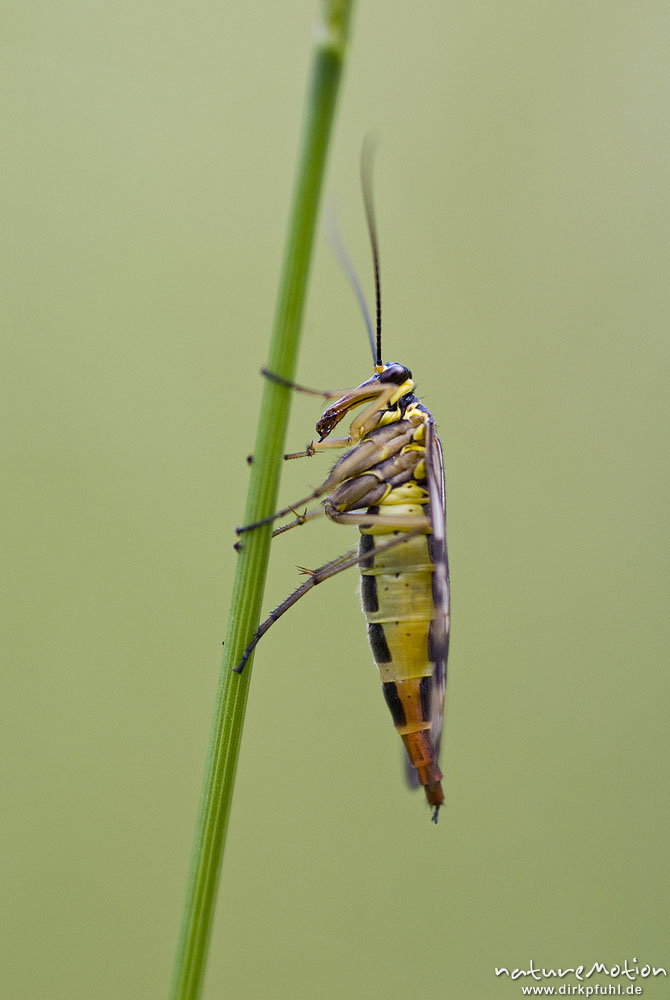 Gemeine Skorpionsfliege, Panorpa communis, Panorpidae, Weibchen auf Grashalm, Seitenansicht, Streuobstwiese am Sengerfeld, Göttinger Wald, A nature document - not arranged nor manipulated, Göttingen, Deutschland