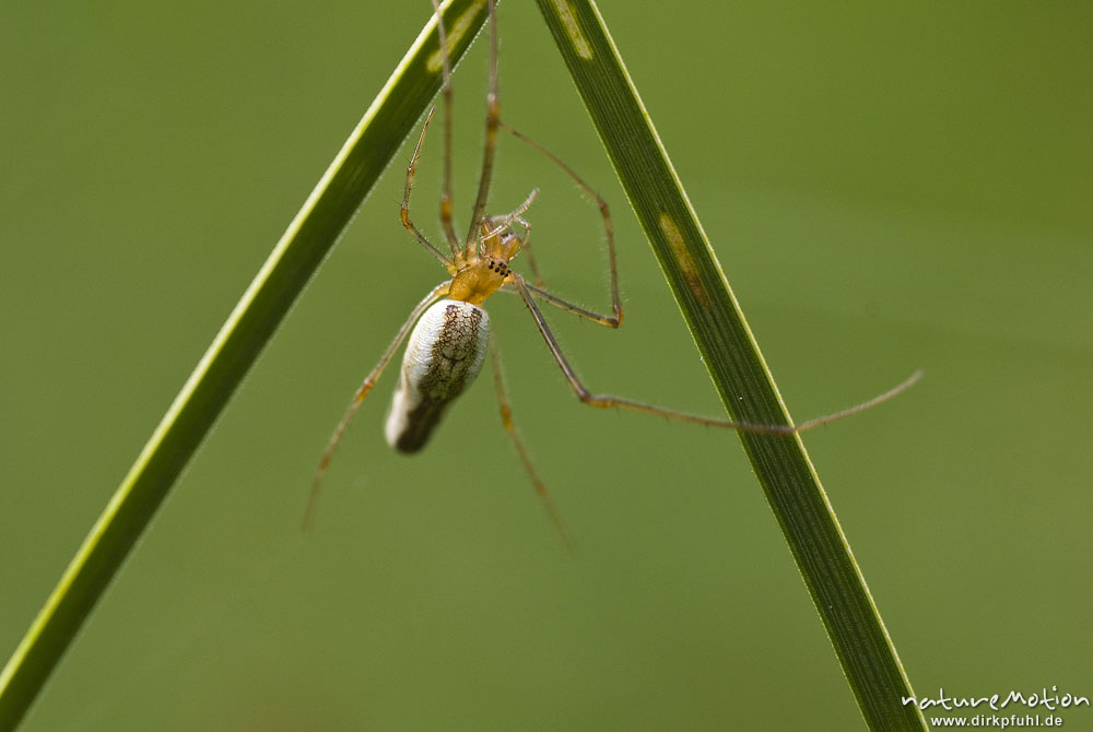 Gemeine Streckerspinne, Tetragnatha extensa, Tetragnathidae, Weibchen beim Nestbau, Augen sehr gut zu erkennen, Quellteich Kerstlingeröder Feld, Göttingen, Deutschland