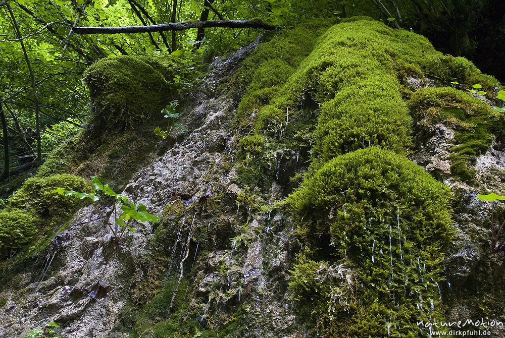 Gemeines Starknervmoos, Palustriella commutata, Cratoneuron commutatum, Amblystegiaceae, an kleinem Wasserfall auf Kalkfelsen, Bohinjer See Wocheiner See, Slowenien