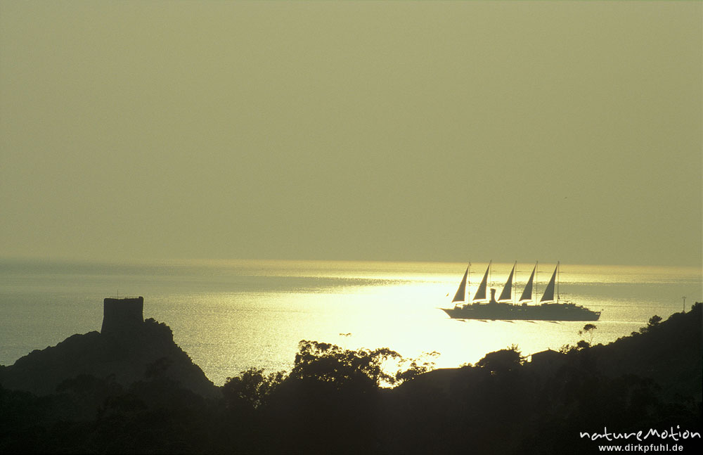 Genuesenturm von Porto, Silhouette gegen Meer und Abendhimmel, daneben 5-Mast-Segler, Korsika, Frankreich