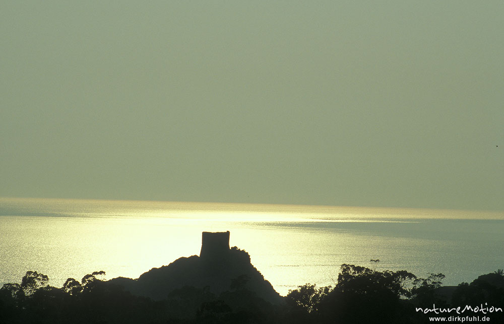 Genuesenturm von Porto, Silhouette gegen Meer und Abendhimmel, Korsika, Frankreich