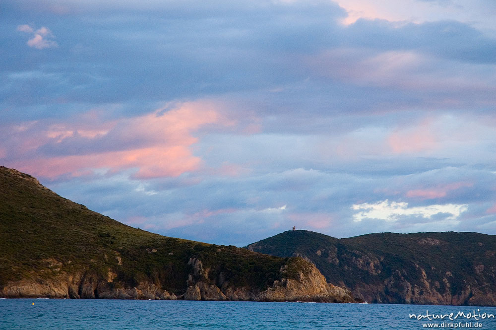 Genueser Turm, Plage d'Arone, Küstenlinie und Brandung im Abendlicht Korsika, Frankreich