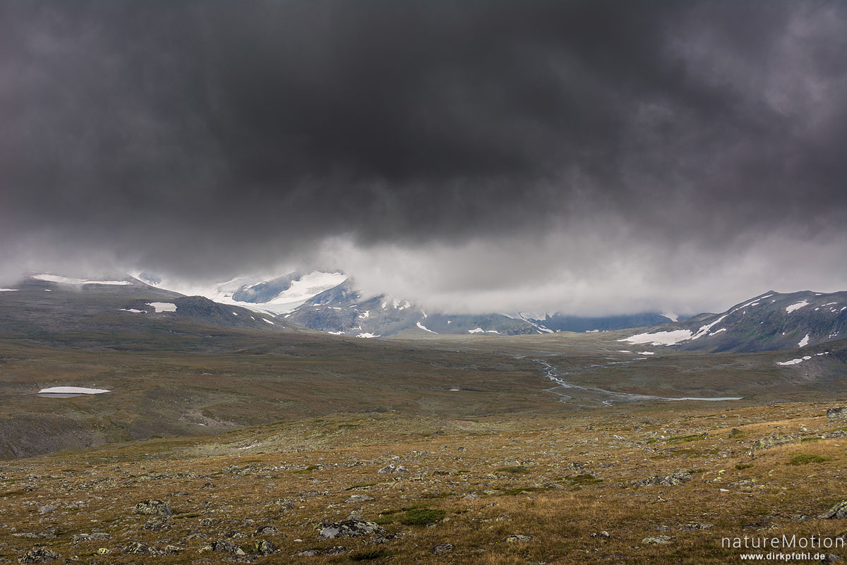 geröllübersähte Hochebene, Gletscher Blabrean und Styggehobrean, Gletscherfluss Blatjonnae, Regenwolken, Wanderweg Glitterheim - Gjendesheim, Jotunheimen, Jotunheimen, Norwegen