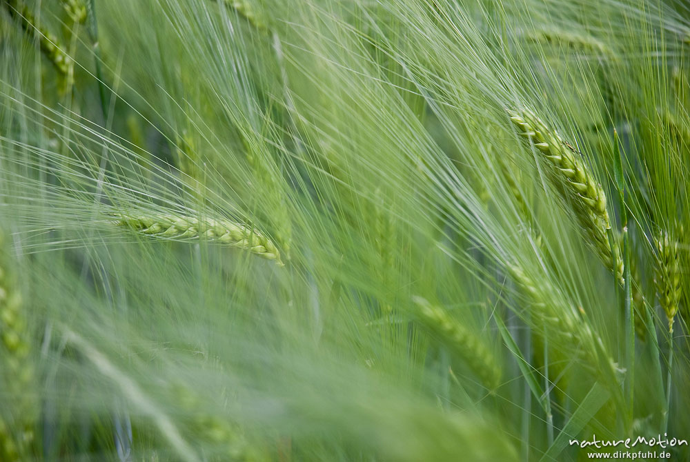 Gerste, Hordeum vulgare, Poaceae, noch grüne Ähren, vom Wind bewegt, Feld, Mackenrode bei Göttingen, Deutschland