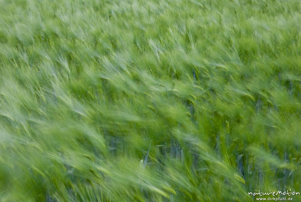 Gerste, Hordeum vulgare, Poaceae, noch grüne Ähren, vom Wind bewegt, Feld, Mackenrode bei Göttingen, Deutschland