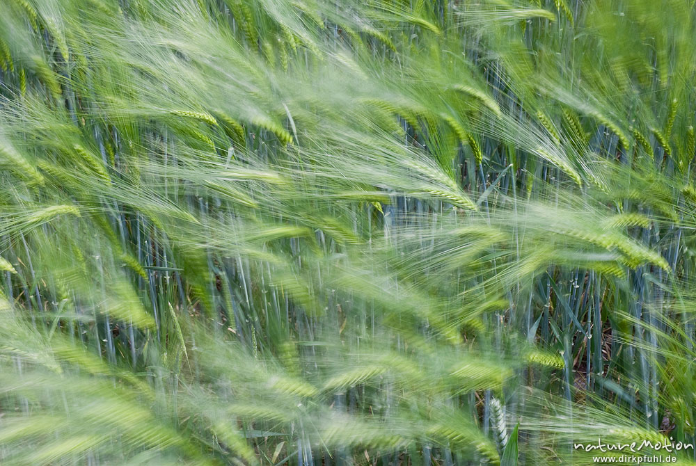 Gerste, Hordeum vulgare, Poaceae, noch grüne Ähren, vom Wind bewegt, Feld, Mackenrode bei Göttingen, Deutschland