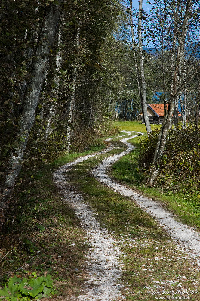 geschlängelter Weg zum Barmsee, Waldrand Klais Oberbayern, Deutschland