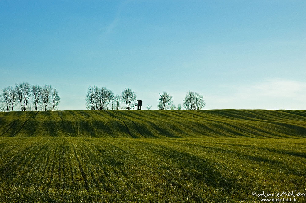 Getreidefeld mit Bodenwellen, frisch ausgetriebenes Getreide, Saatlinien, Seeburger See, Deutschland
