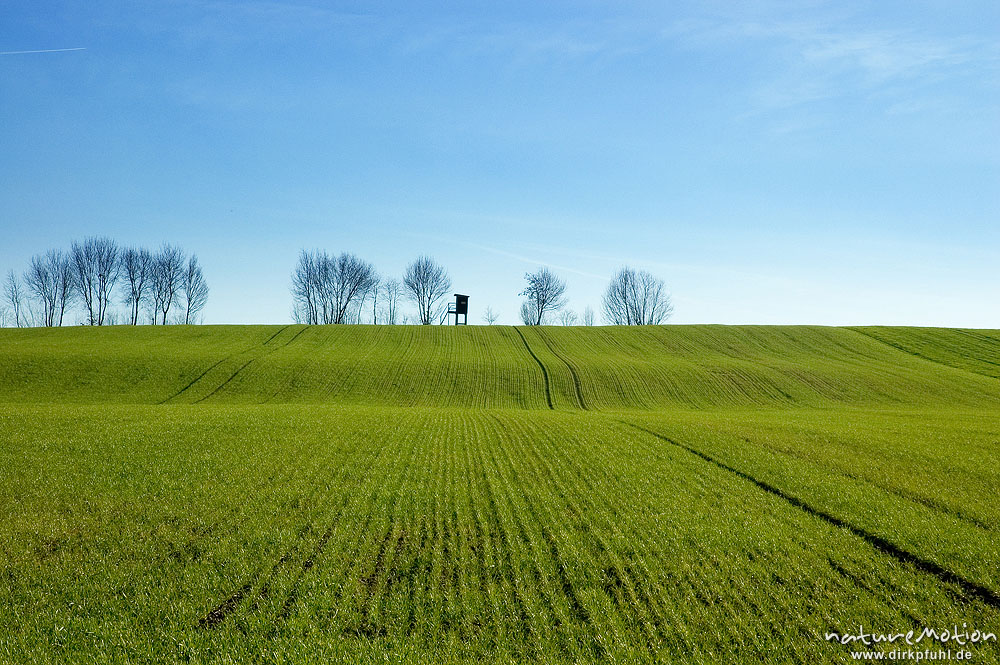 Getreidefeld mit Bodenwellen, frisch ausgetriebenes Getreide, Saatlinien, Seeburger See, Deutschland
