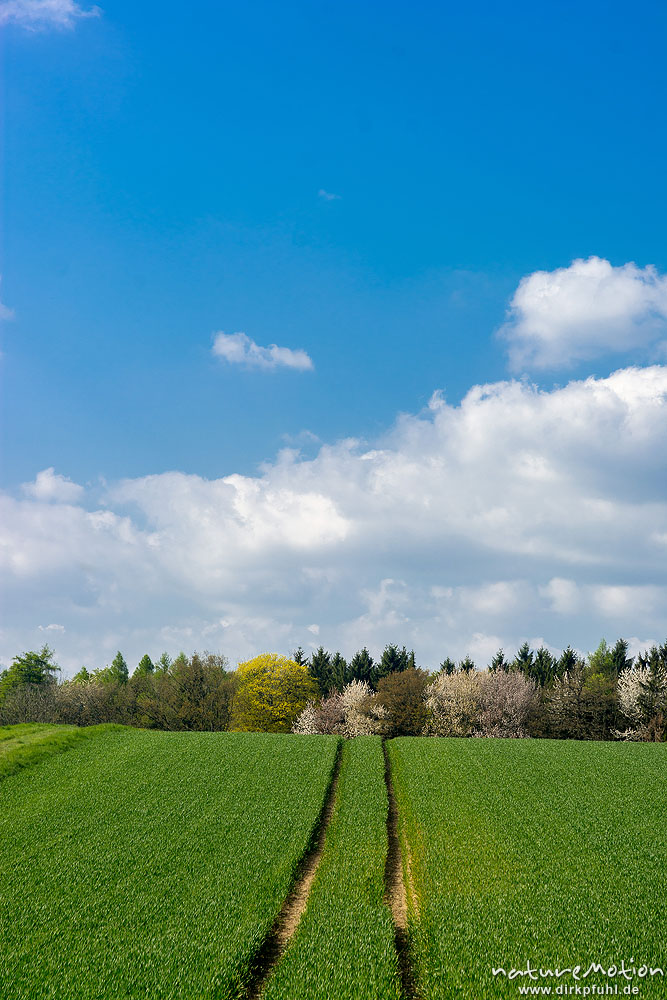 Getreidefeld, Schlehe, Schwarzdorn, Prunus spinosa, Rosaceae, blühende Hecke, Leinetal südlich Göttingen, Göttingen, Deutschland