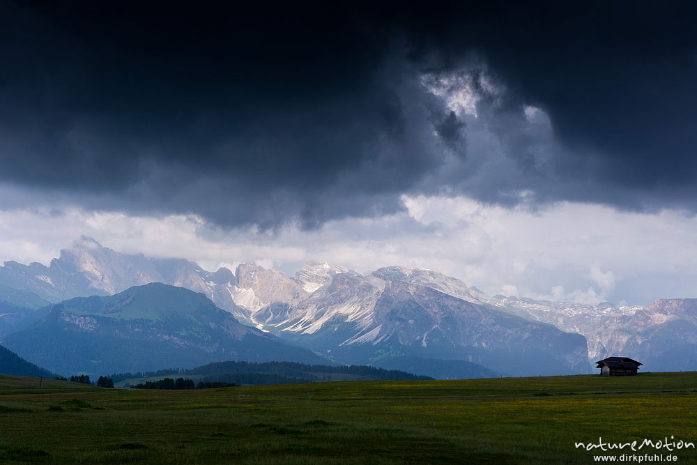 Gewitterwolken, H?tten und Almwiesen, Geisslergruppe, Seiseralm (S?dtirol), Italien