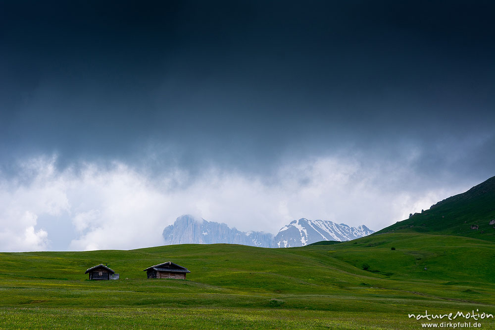 Gewitterwolken, H?tten und Almwiesen, Langkofel und Plattkofel, Seiseralm (S?dtirol), Italien