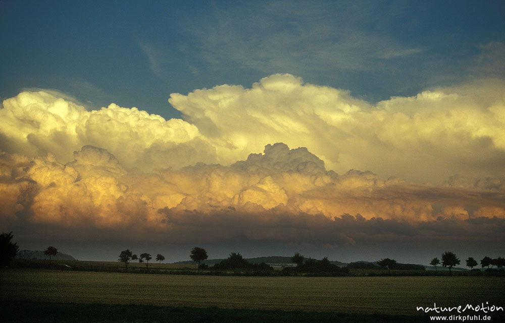 Gewitterwolken im Abendrot, aus fahrendem Zug fotografiert, zwischen Hannover und Göttingen, , Deutschland