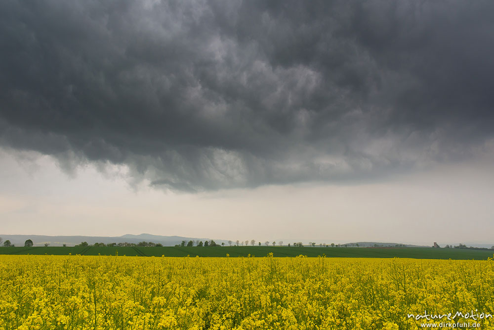 Gewitterwolken über blühendem Rapsfeld, Göttingen, Deutschland