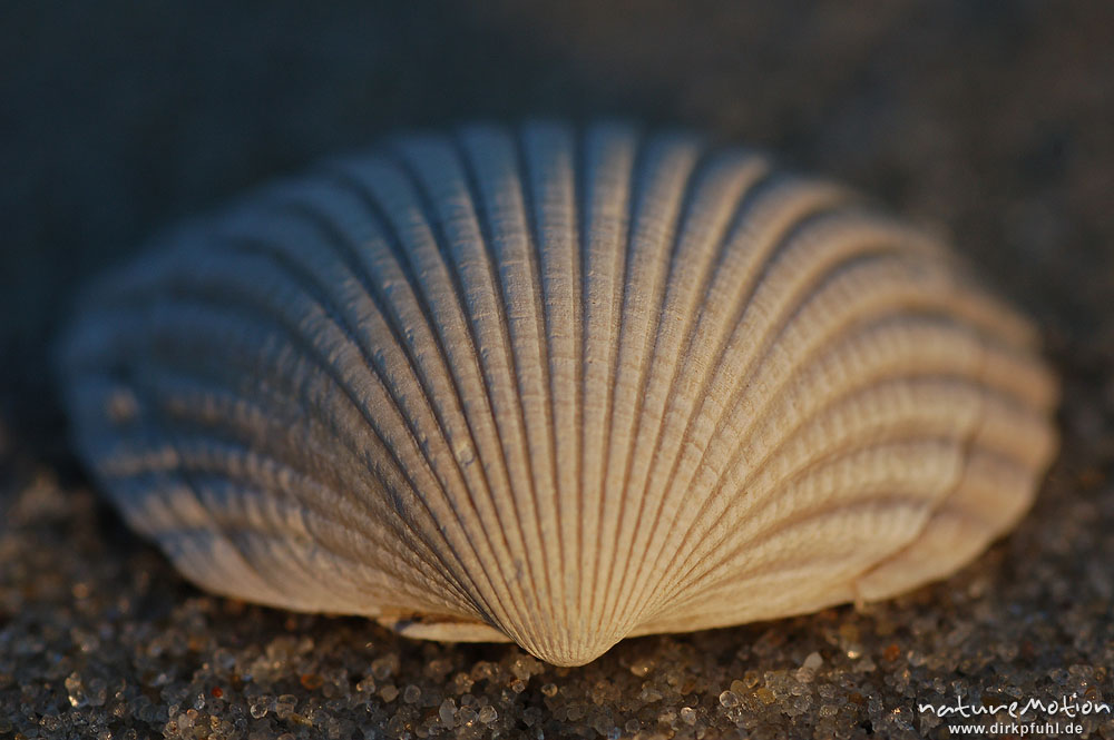 Gewöhnliche Herzmuschel, Cerastoderma edule, Cardiidae, Schale im Sand, Rippenstruktur, Amrum Amrum, Deutschland
