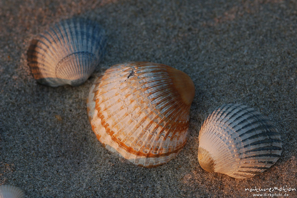 Gewöhnliche Herzmuschel, Cerastoderma edule, Cardiidae, Schalen im Sand, Amrum Amrum, Deutschland