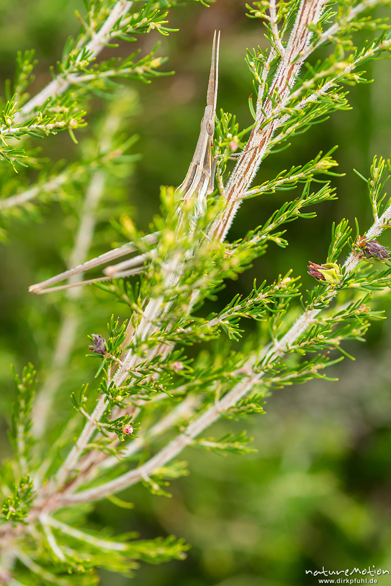 Gewöhnliche Nasenschrecke, Acrida ungarica, Feldheuschrecken (Acridida), perfekt getarntes Tier zwischen Sträuchern in der Macchia, Vallebuia, Elba, Italien