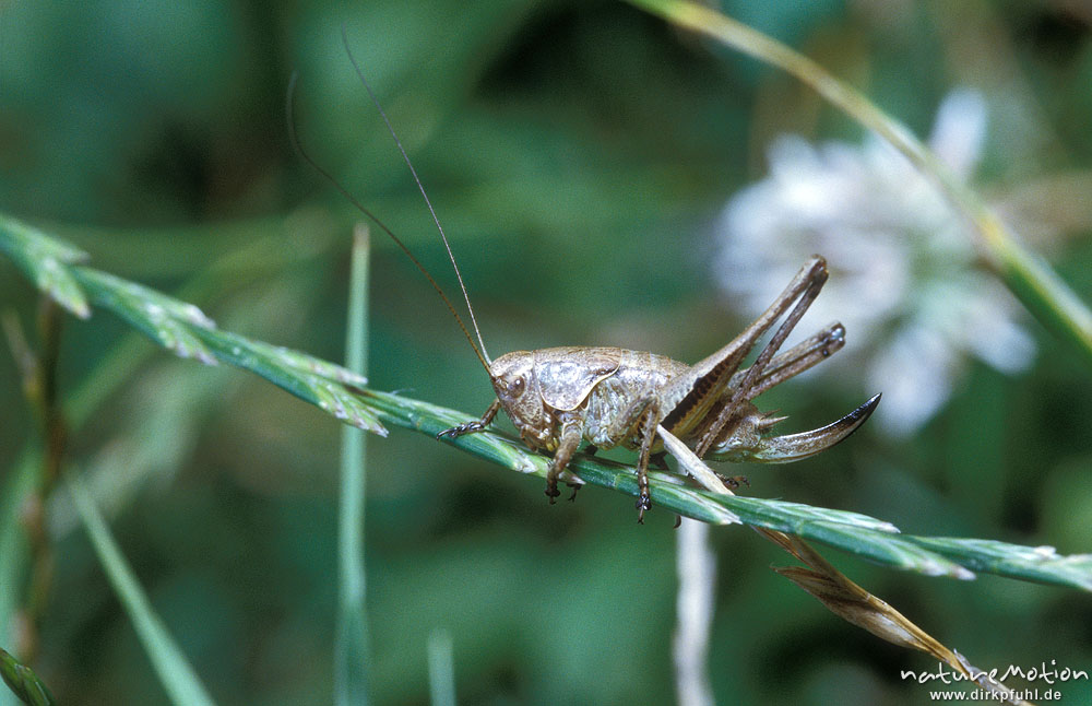 Gewöhnliche Strauchschrecke Weibchen, Pholidoptera griseoaptera, im Gras, Sängerfeld, Göttinger Wald, Göttingen, Deutschland