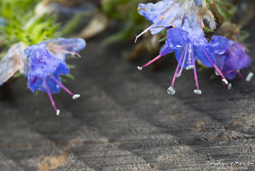 Gewöhnlicher Natternkopf, Echium vulgare, Boraginaceae, Blüten, Antheren mit Tautropfen, Trieb auf Schnittfläche eines Baumstumpfes, Bohinjer See Wocheiner See, Slowenien
