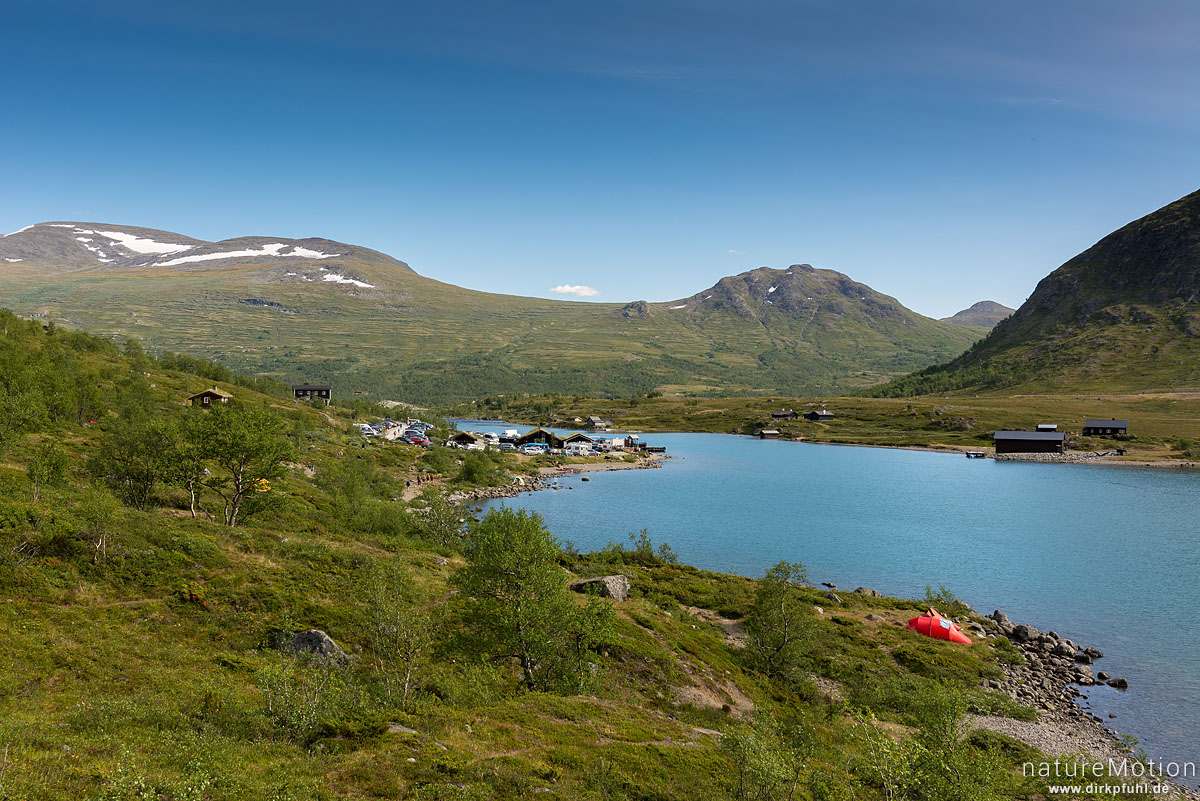 Gjendesheim mit F?hranleger und Seeufer, Austritt des Sjoa, Jotunheimen, Gjendesheim, Norwegen