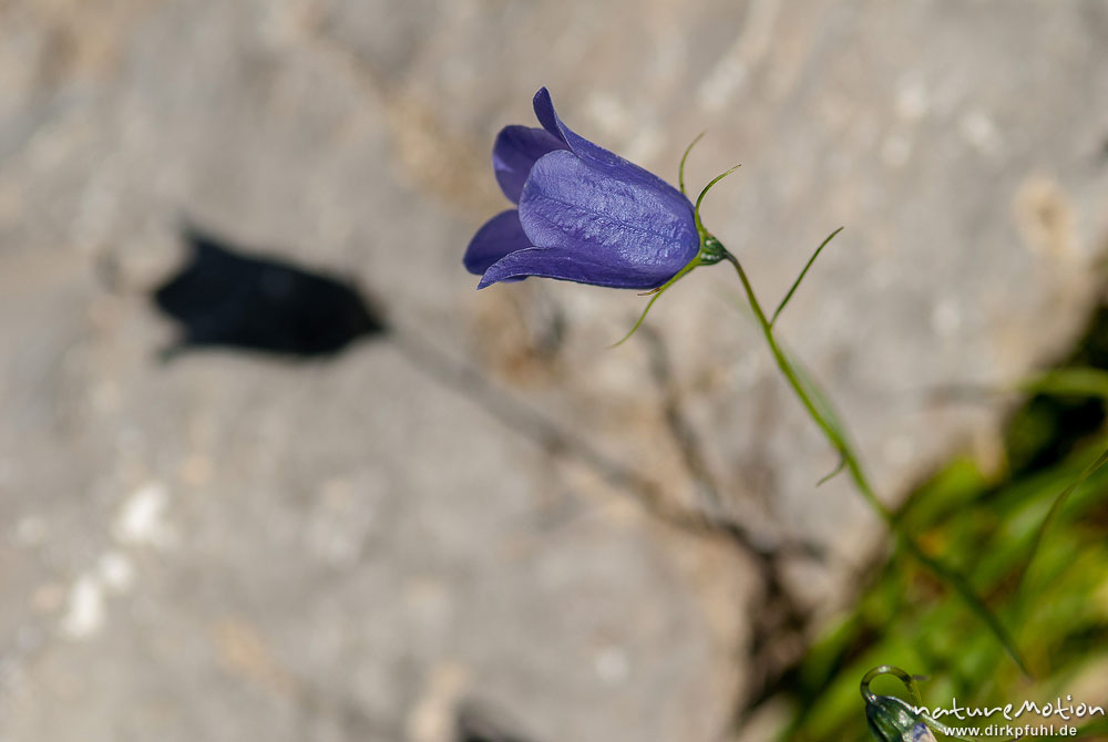 Glockenblume, Campanula spec., blühende Pflanze, Schattenwurf auf Felsen, Coburger Hütte, Ehrwald, Östereich