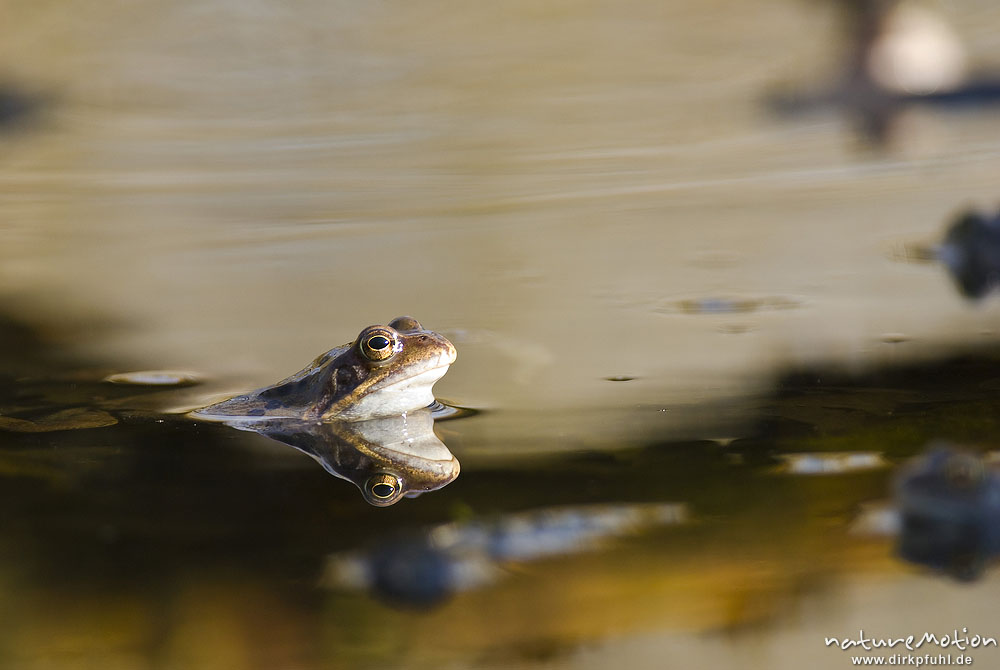 Grasfrosch, Rana temporaria, Echte Frösche (Ranidae), mehrere Tiere im Laichgewässer, Augen spiegeln sich im Wasser, Erlenbruch am Herberhäuser Stieg, A nature document - not arranged nor manipulated, Göttingen, Deutschland