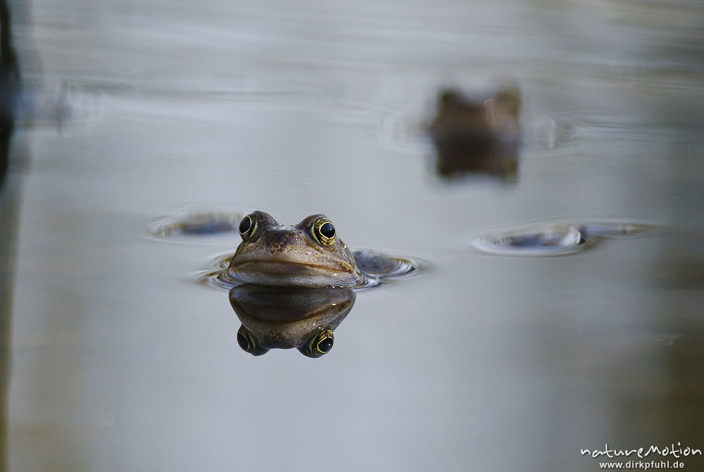 Grasfrosch, Rana temporaria, Echte Frösche (Ranidae), mehrere Tiere im Laichgewässer, Augen spiegeln sich im Wasser, Erlenbruch am Herberhäuser Stieg, A nature document - not arranged nor manipulated, Göttingen, Deutschland