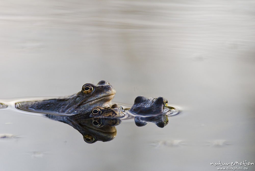Grasfrosch, Rana temporaria, Echte Frösche (Ranidae), Paar im Laichgewässer, Augen spiegeln sich im Wasser, Erlenbruch am Herberhäuser Stieg, A nature document - not arranged nor manipulated, Göttingen, Deutschland