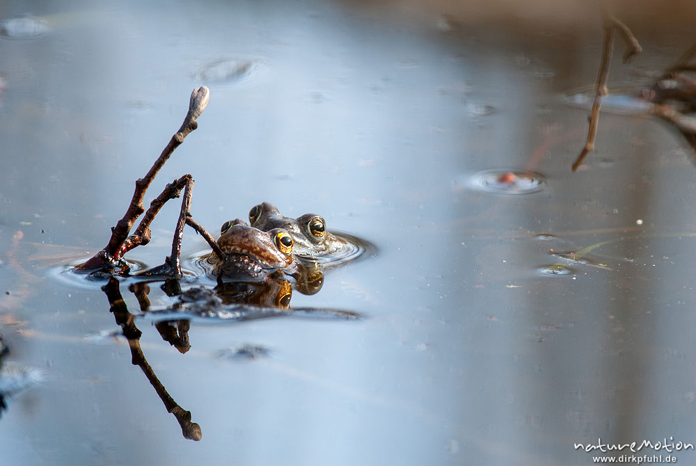 Grasfrosch, Rana temporaria, Echte Frösche (Ranidae), Paar im ruhigen Wasser, Erlenbruch Herberhäuser Stieg, A nature document - not arranged nor manipulated, Göttingen, Deutschland